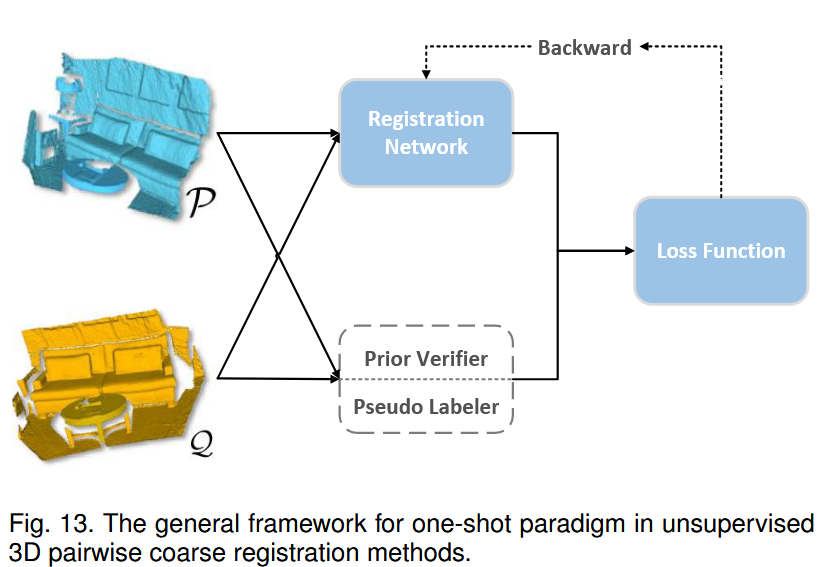 与迭代范式不同,该范式通常只以一次性的方式对输入对进行注册。因此,这些方法在训练过程中往往侧重于挖掘先验信息或从无标签数据中生成伪标签,以提升配准性能。如图13所示。