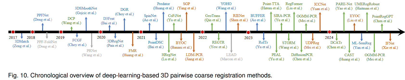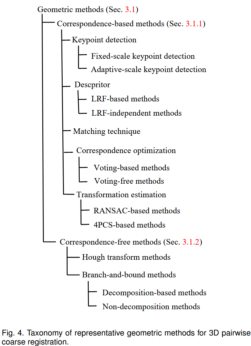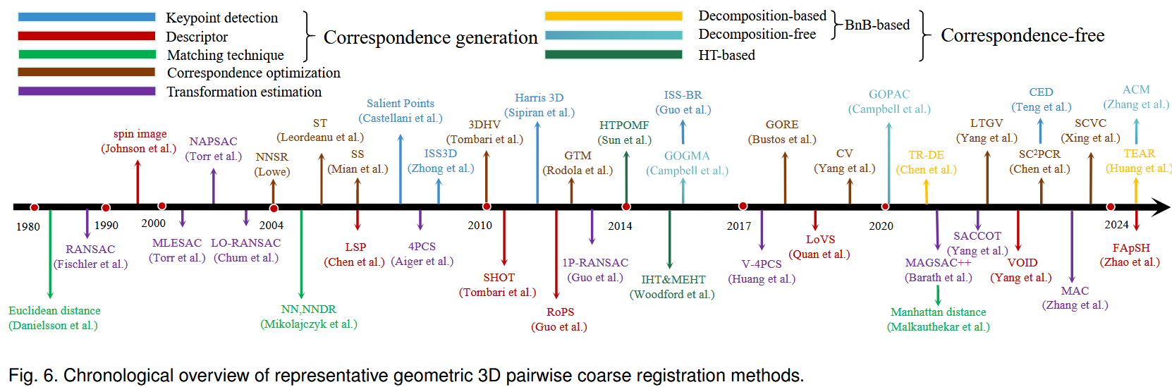 该部分总结了基于几何方法的成对粗配准pairwise coarse registration方法,分类和时间概述分别见图4和图6。
