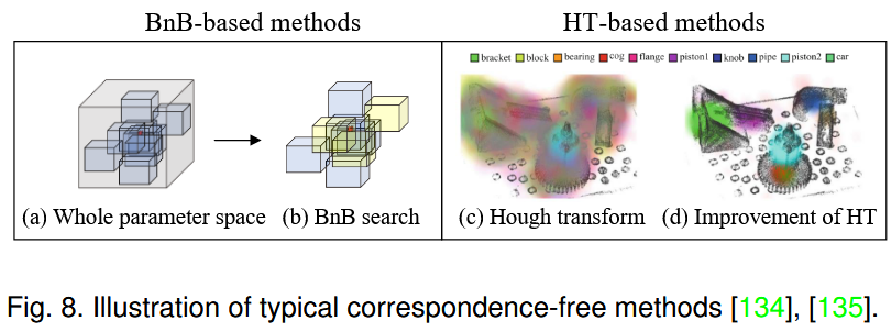 这些方法通过最优参数搜索进行两两粗配准,不需要进行对应生成或进一步处理,如图8所示。此外,非对应方法可以大致分为两类,即基于Hough变换( HT-based )和基于BnB的方法。