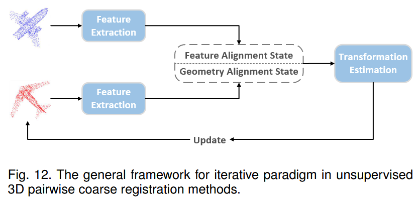 这些方法类似于监督方法中常用的多阶段范式,在训练和推断阶段迭代地进行点云配准。此外,两种策略,即特征对齐和几何对齐,用于对齐输入对,如图12所示。