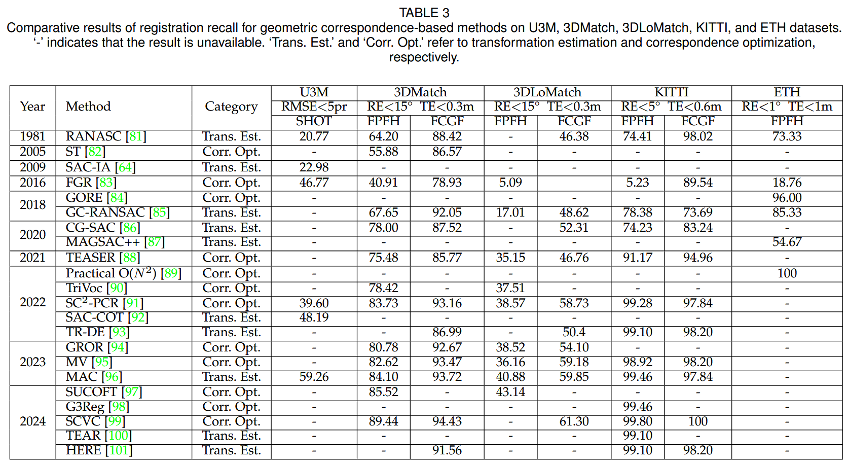 由于描述符的限制和点云数据中的杂乱、遮挡等挑战,初始对应集往往包含许多错误的匹配(离群点)。为了解决这个问题,研究人员开发了各种优化技术,通常被分类为基于选举的和免投票。表3给出了对应优化方法的性能概述。