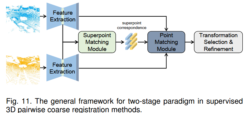 两阶段范式通常采用由粗到精的机制,其优越性在图像匹配任务中得到了证明[ 217 ]。如图11所示,这些方法通常将输入点云降采样为超点,并将其匹配以获得粗对应点,然后根据邻域关系将这些对应点传播到个别点。它们最终产生稠密的点对应。