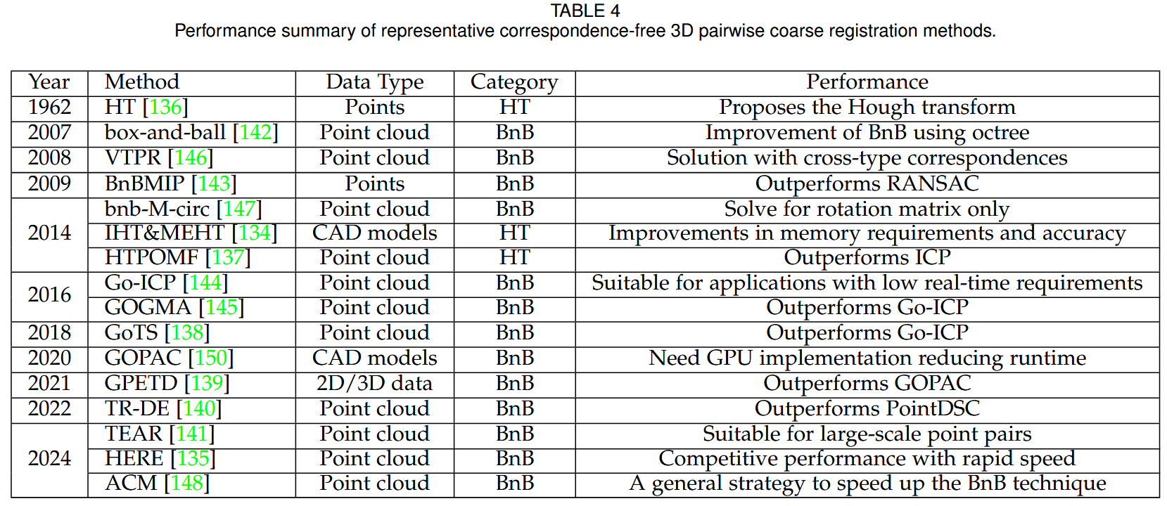 - 无对应几何方法。这些方法通常通过参数搜索来求解最优的最大一致解。然而,6 - DoF的高维搜索空间导致了指数级的时间复杂度。因此,基于BnB的方法由于其全局最优解和有效性而越来越受欢迎。