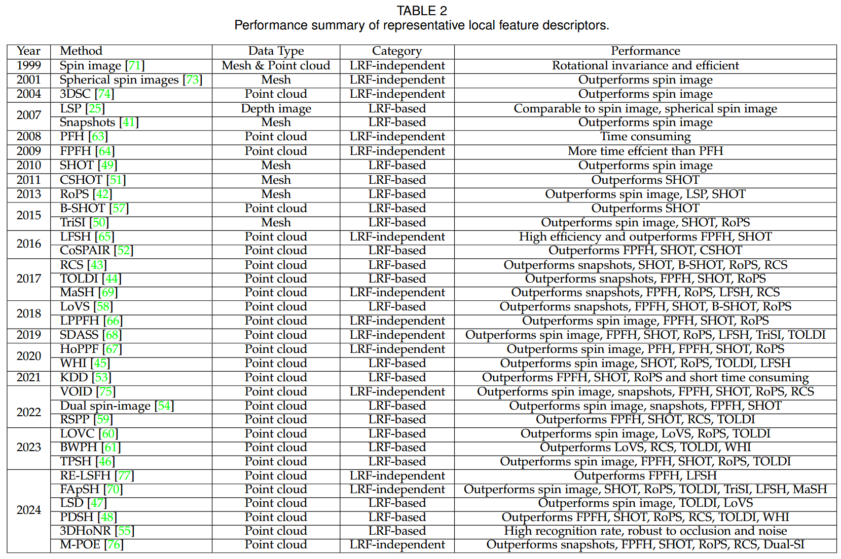 一旦检测到关键点,就可以提取周围局部表面的几何特征,生成局部特征描述子。如图5所示,根据点云局部表面是否建立局部参考框架( local reference frame,LRF ),这些局部特征描述子可以进一步分为两类:基于LRF的和不依赖于LRF的。表2给出了局部表面特征描述方法的性能概述。