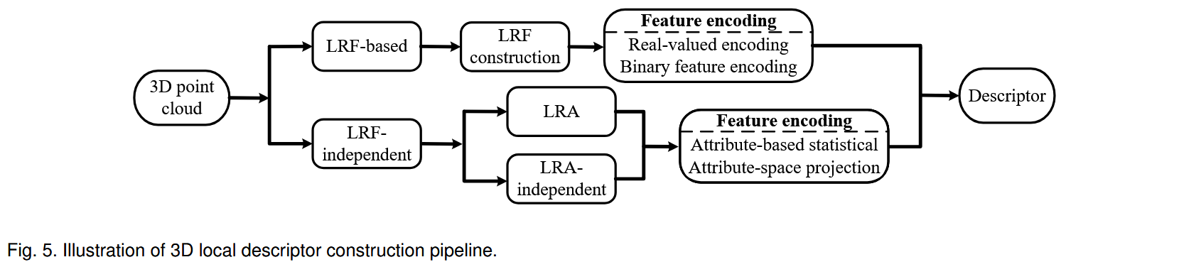 这些描述符首先在局部表面构建一个LRF,然后基于LRF编码表面的空间和几何信息。这些方法可以进一步分为两类,即实值编码和二进制特征编码。