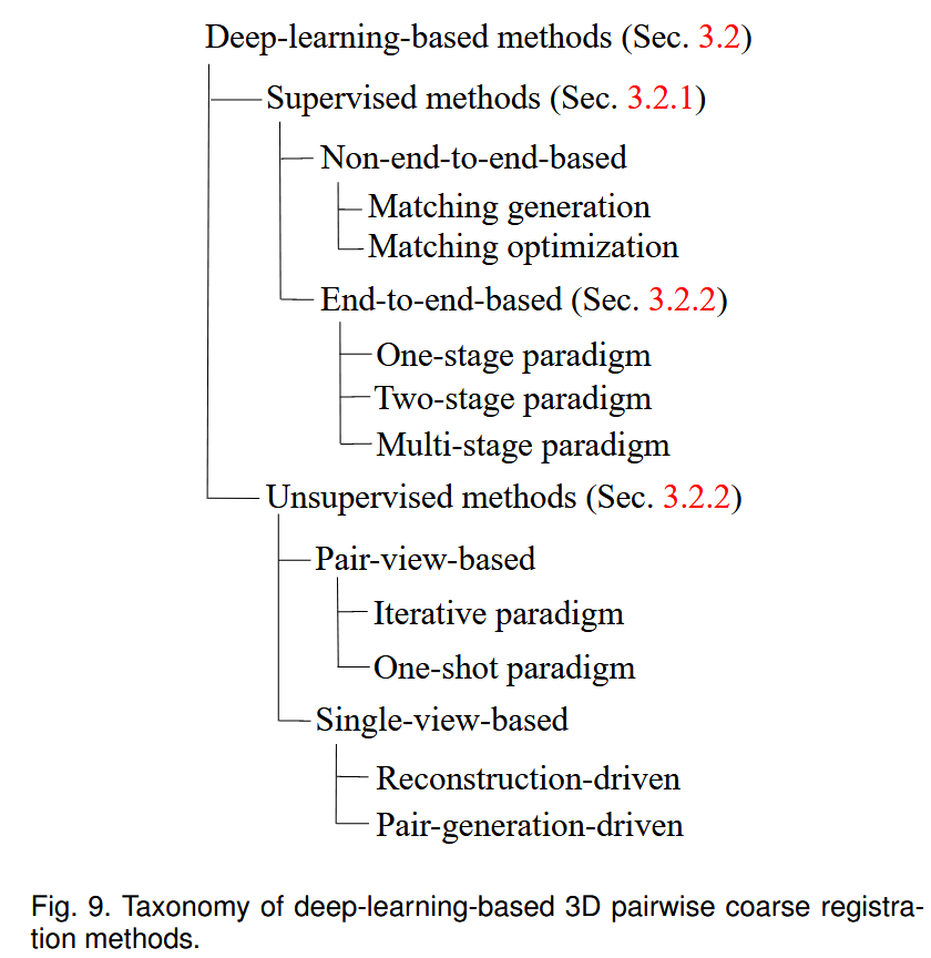 该部分总结了基于深度学习的成对粗配准方法。分类法、年代概述和性能比较见图9,图10和表。5 .