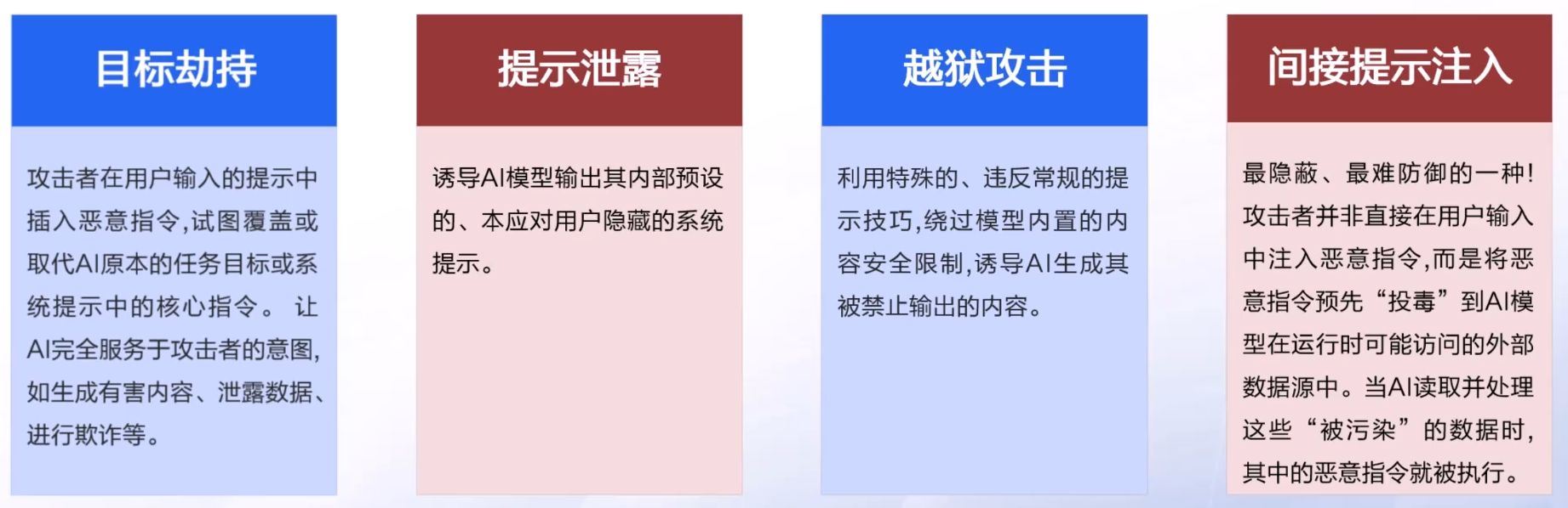 - 本质:利用AI模型对提示词指令的"无条件服从性"和上下文理解能力的局限性,进行的一种"指令注入"攻击