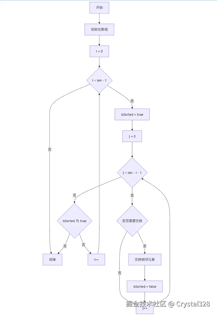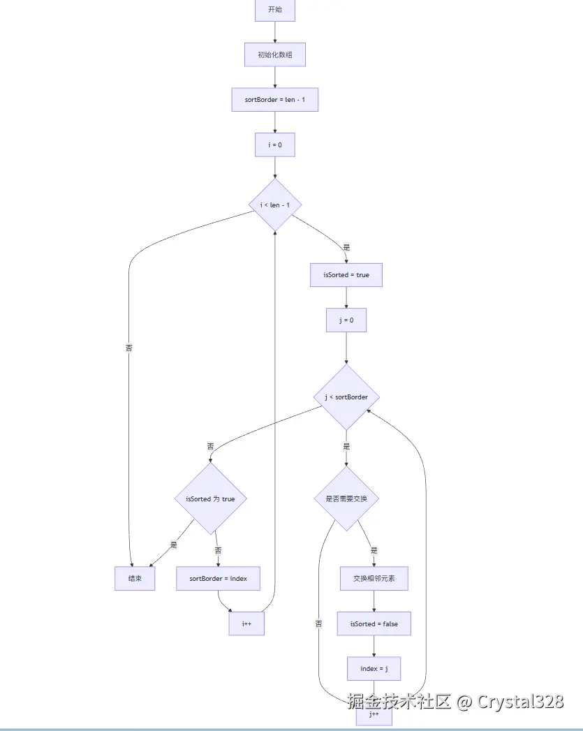 isSorted = true; // 有序标记,每轮开始默认为有序,如果一旦发生交换,就会变成flag=false,无序