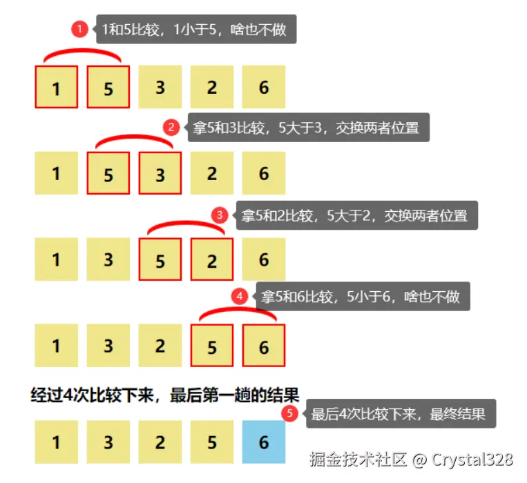 - 内部循环用来实现每一轮的交换处理。先进行元素比较,如果元素大于右侧相邻相元素,则两元素位交换,如果不大于,则啥也不做