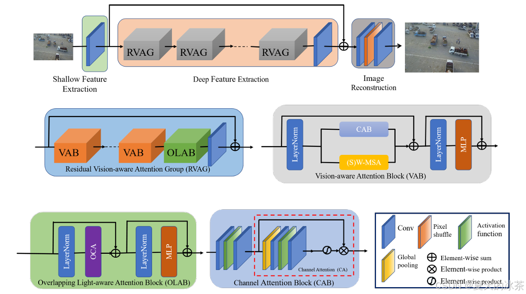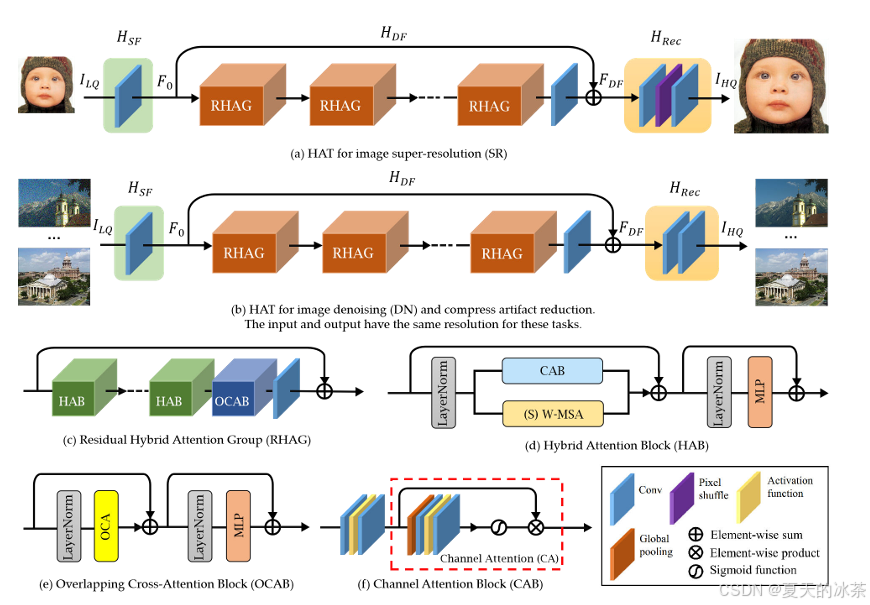 下面是关于HAT的工作图,但却是延续了SwinIR的基本结构,将RSTB升级成RHAG,内部的STL也对应升级成HAB,并且在每个Block中加入了一个OCAB。