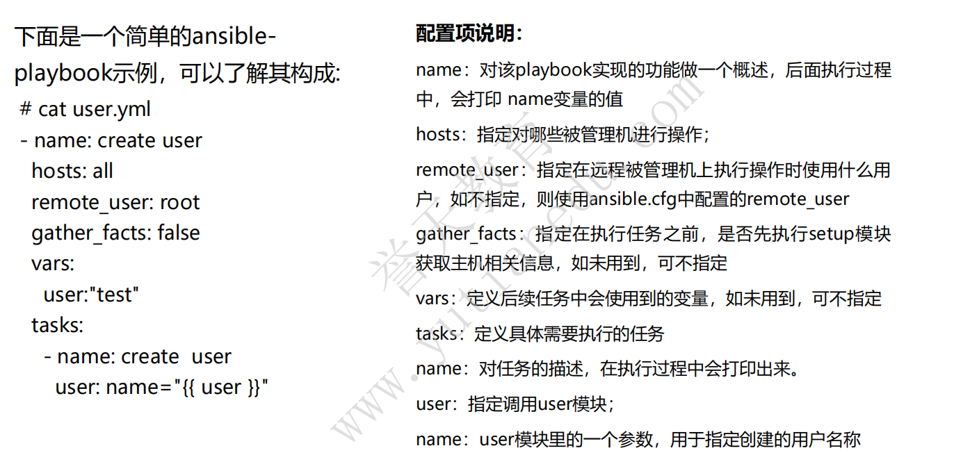 playbook结构说明,playbook是由一个或者是多个play组成的,一个task就是对ansible的模块的调用,将多个play安装顺序的组织到playbook中就是编排