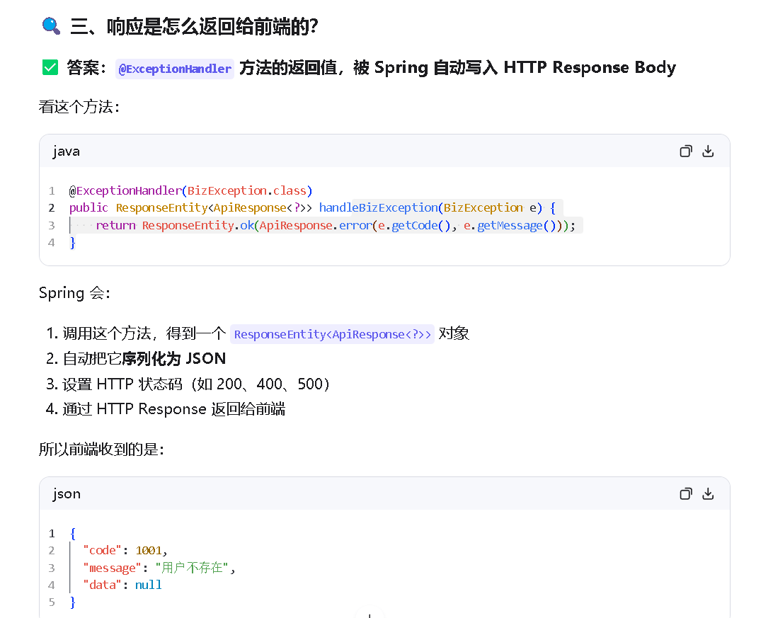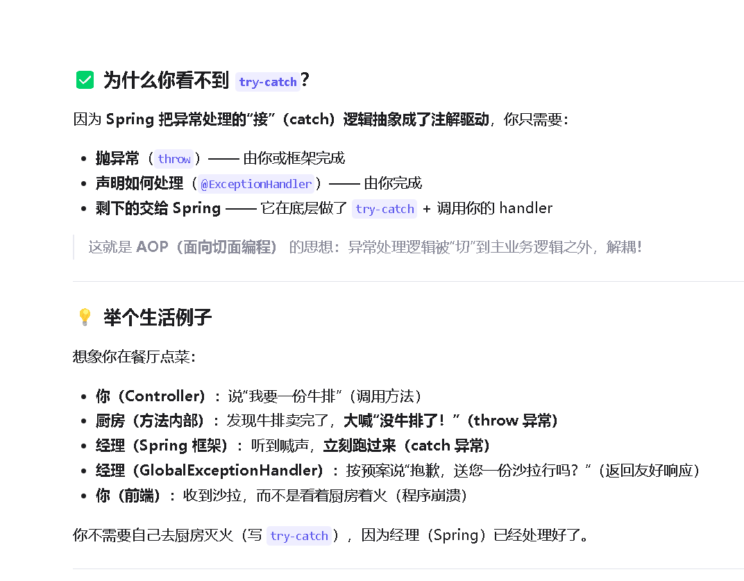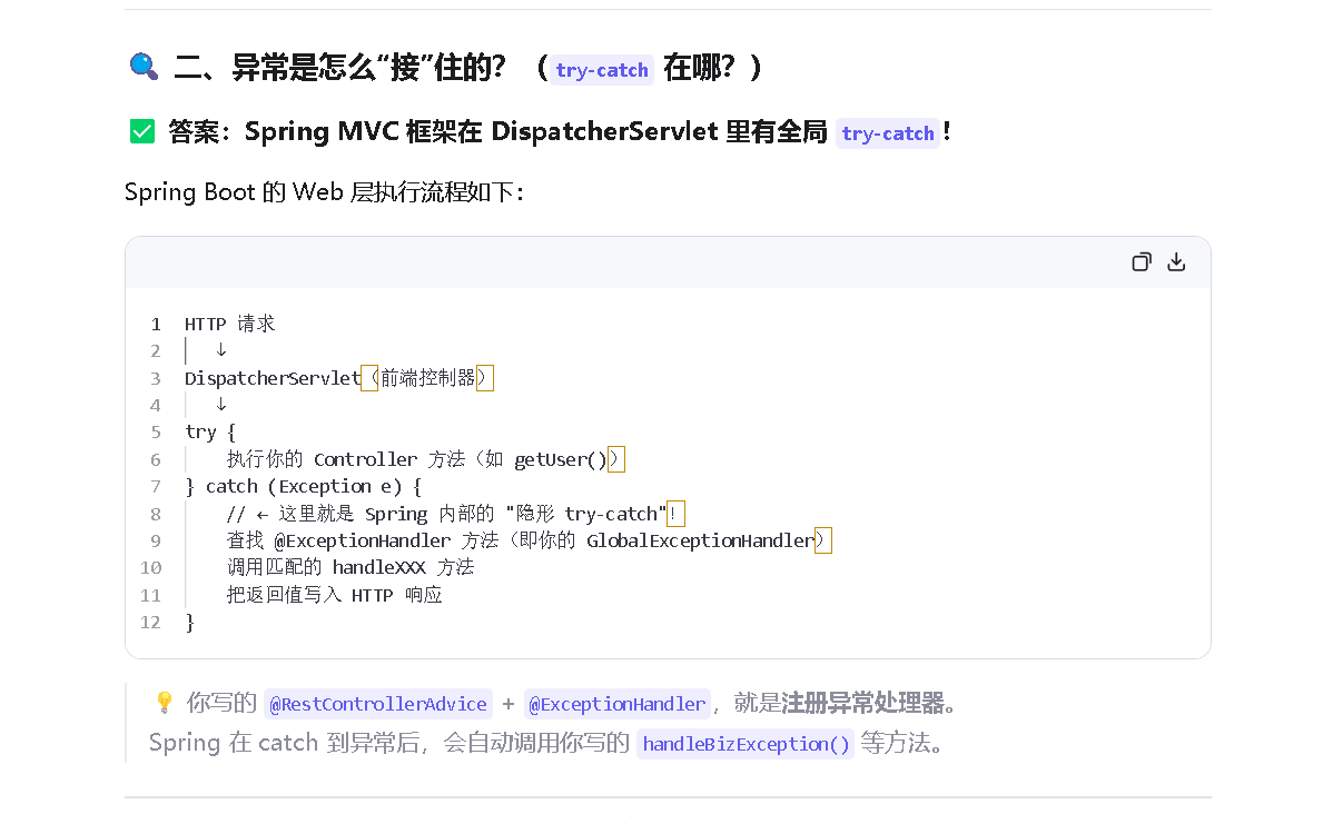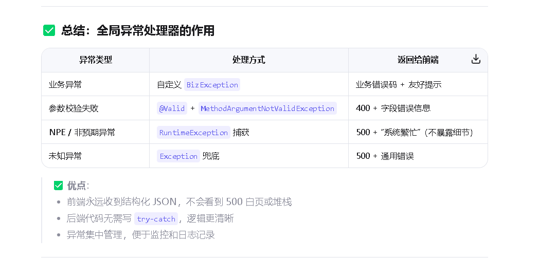 ✅ @RestControllerAdvice = @ControllerAdvice + @ResponseBody,自动返回 JSON。