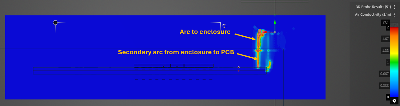 空气导电率结果显示,ESD枪到外壳有一个弧形,箱体到PCB则有一个次级弧形。
