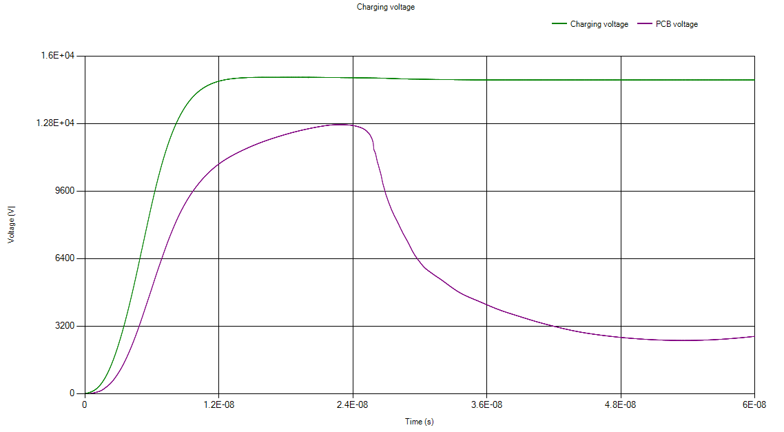 模拟结果如下所示,包括源电压15 kV,以及ESD枪放电到PCB上的电压。
