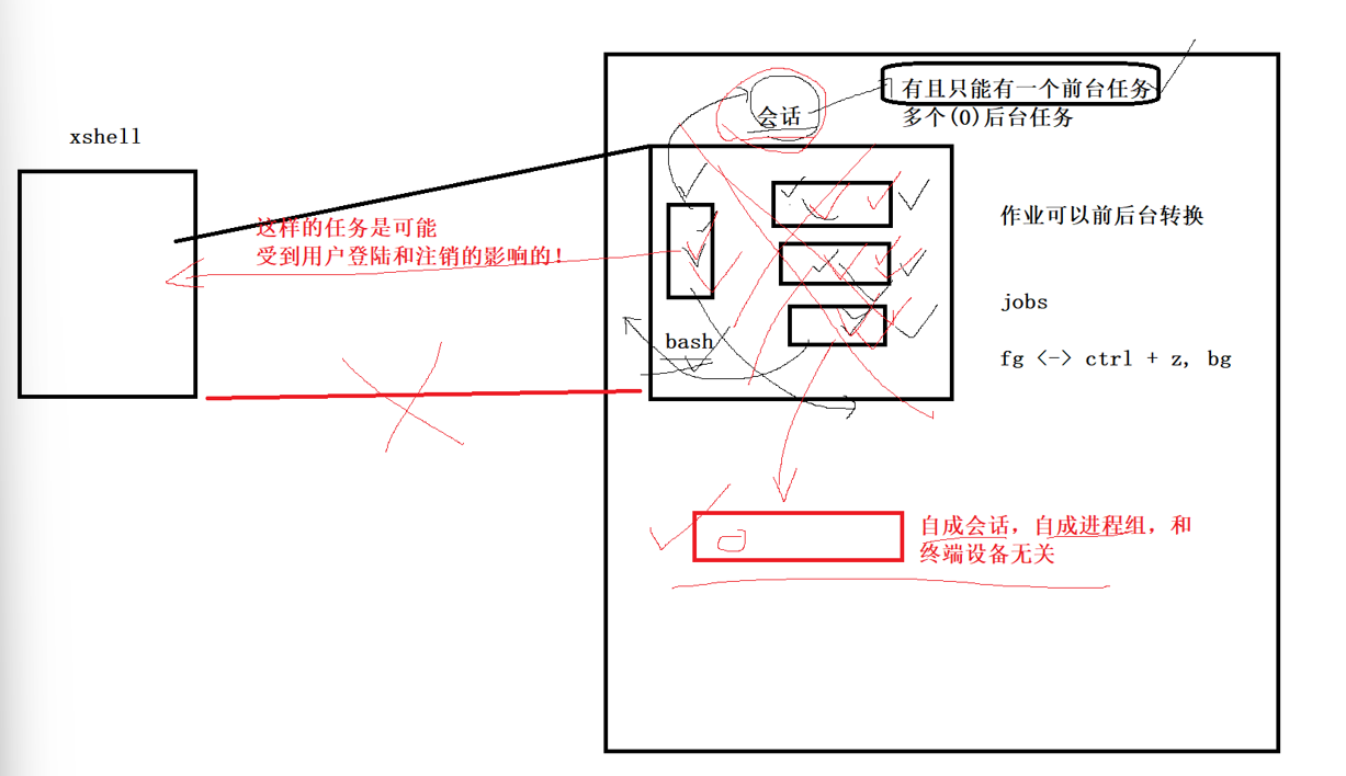 sleep 100 &)。一个会话同一时间只有一个前台任务,可以有多个后台,本质就是你只有一个标准输入标准输出,来一个任务bash就fork+exec来执行