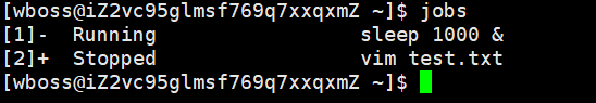 先执行sleep,然后vim,vim的时候ctrl+z(暂停前台任务),后面jobs查询,可以看到状态,一个sleep后台一直再跑,前台暂停了,此时fg作业号