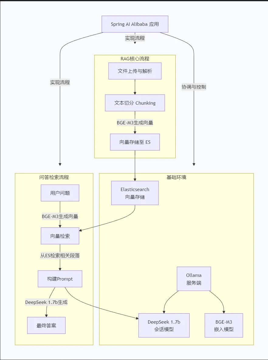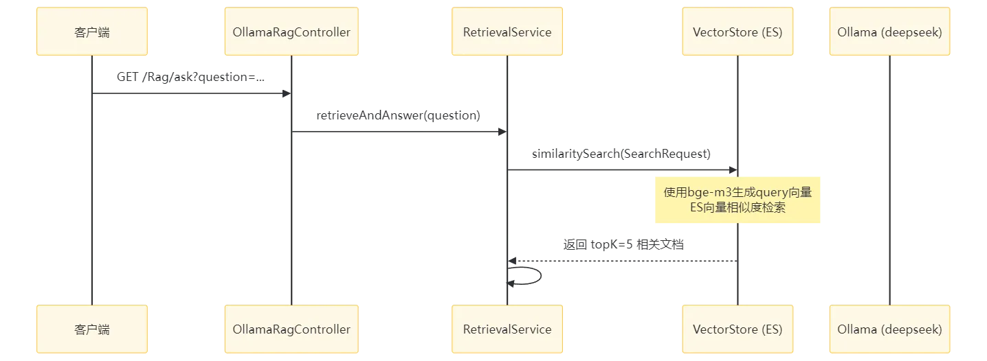 - 向量存储: Document → EmbeddingModel(bge-m3) → ElasticsearchVectorStore