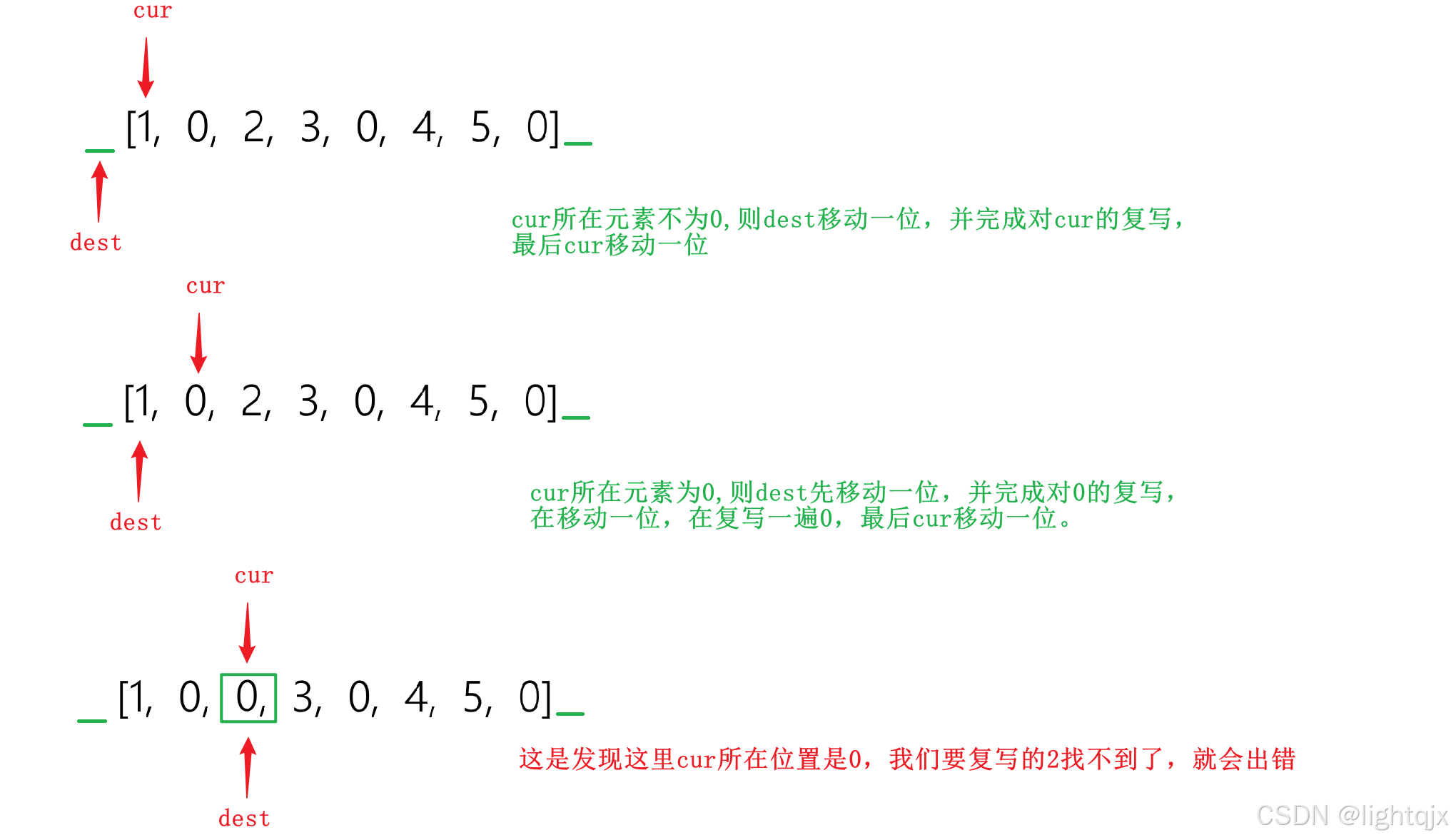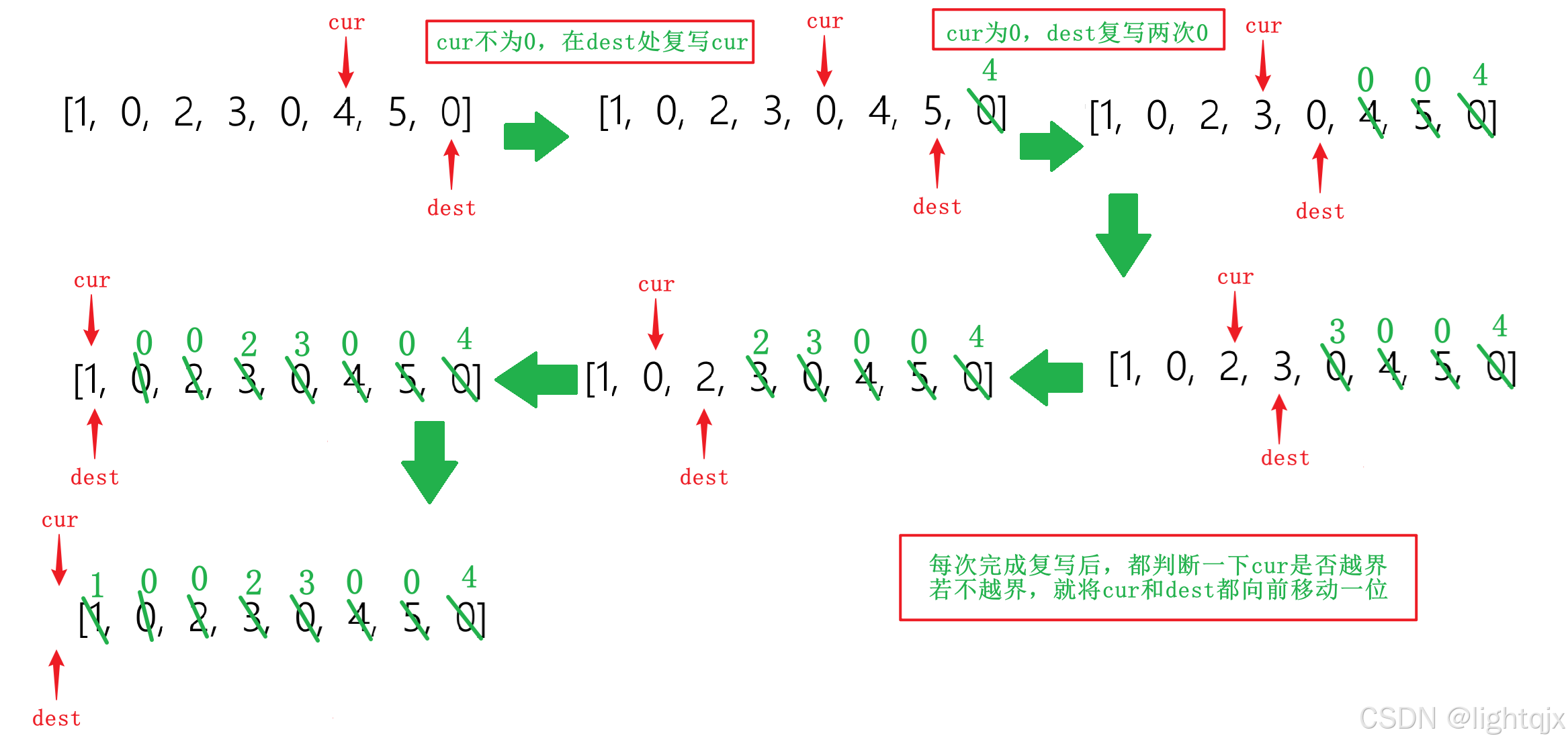 若cur为0,则先将dest所在位置复写为0,再在向前移动一位,再在该位置也复写一个0。最后将dest和cur同时向前移动一位。