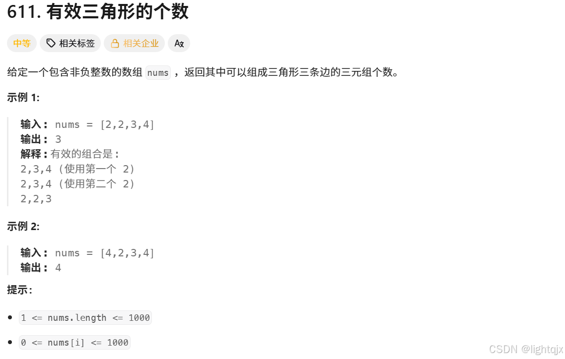 题目链接:611. 有效三角形的个数 - 力扣(LeetCode)