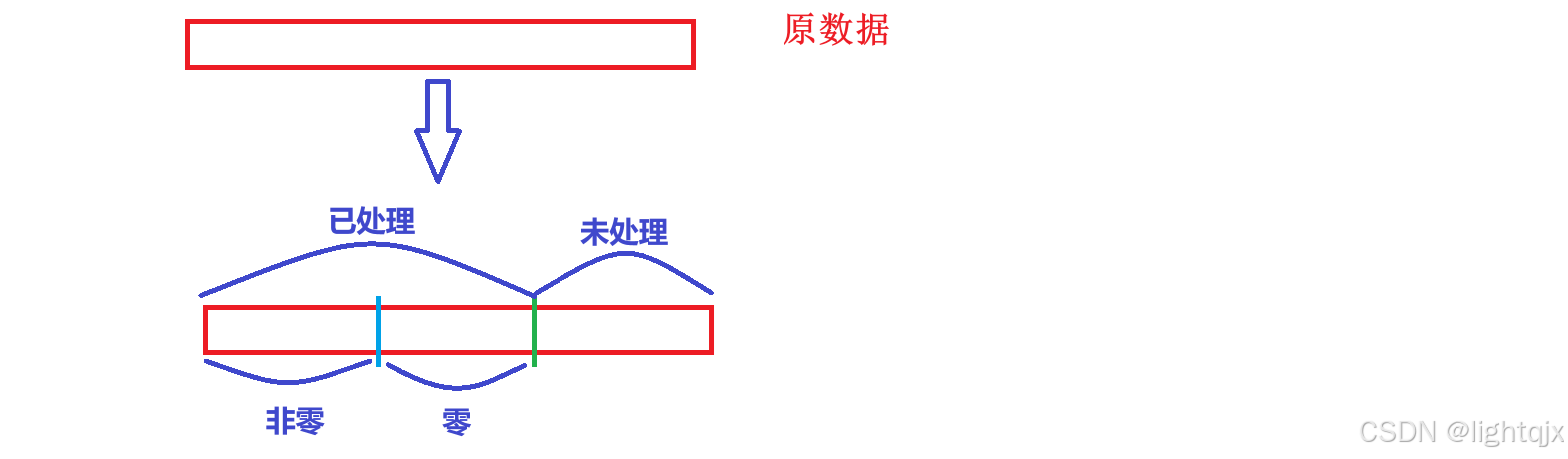 解决这个问题我们需要将数组划分,也就是数组分块的思想。我们最终需要将数组划分为一遍是非零区间部分,一遍为零区间部分,即: