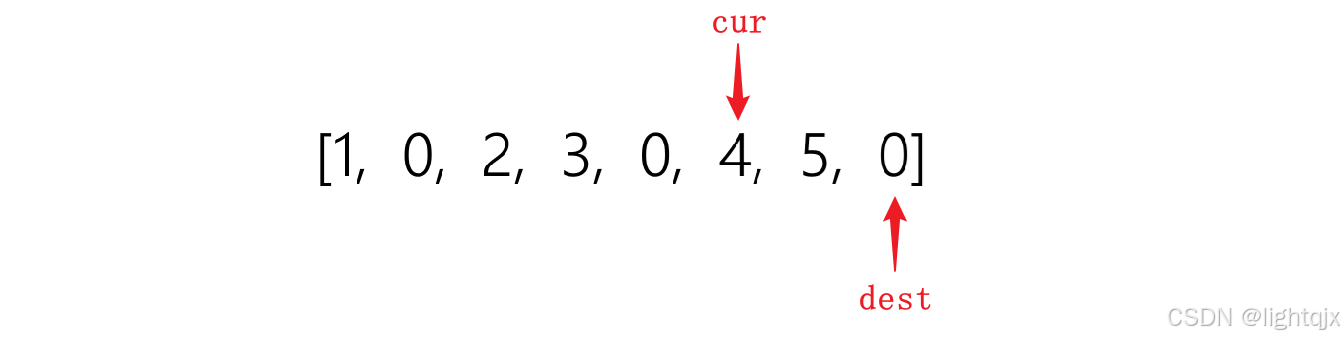 先定义两个指针(即下标)cur和dest。cur首先指向第一个元素,用来遍历;dest指向第一个元素的全一个位置即-1,用来从前往后配合cur指向的元素是否为0,来进行复写。