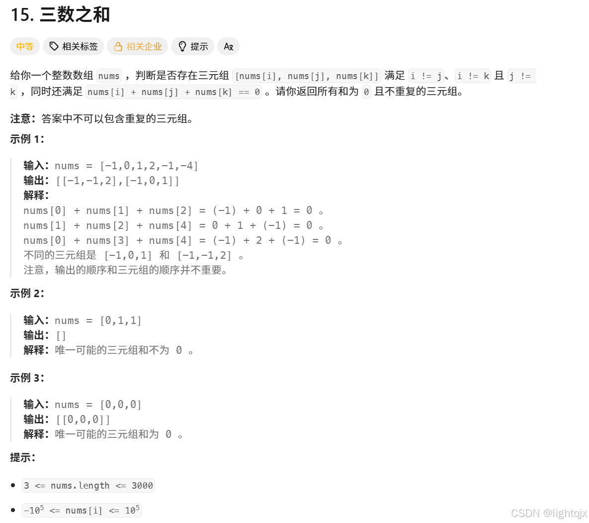 题目的意思,简而言之就是在一个组数据中找到所有三个一组的数据,要求这个三个数据的下标不同,且这三个数据的和等于0。
