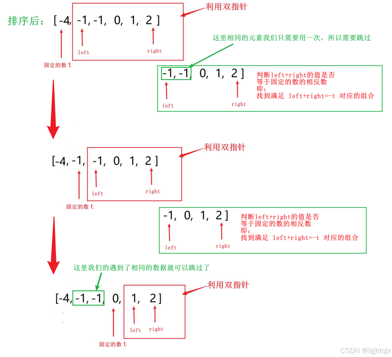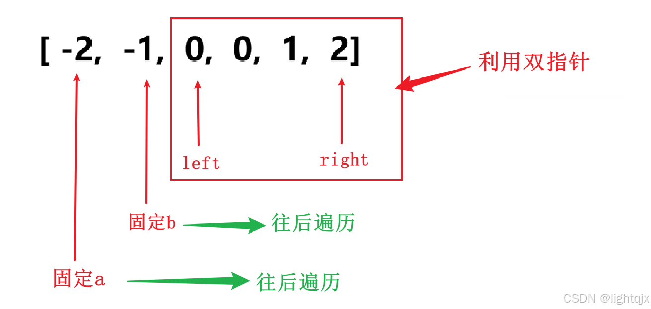 - 当双指针相遇时,再将固定的值是向前移动,再次重复上述操作,直到所固定的值是前面三个值。