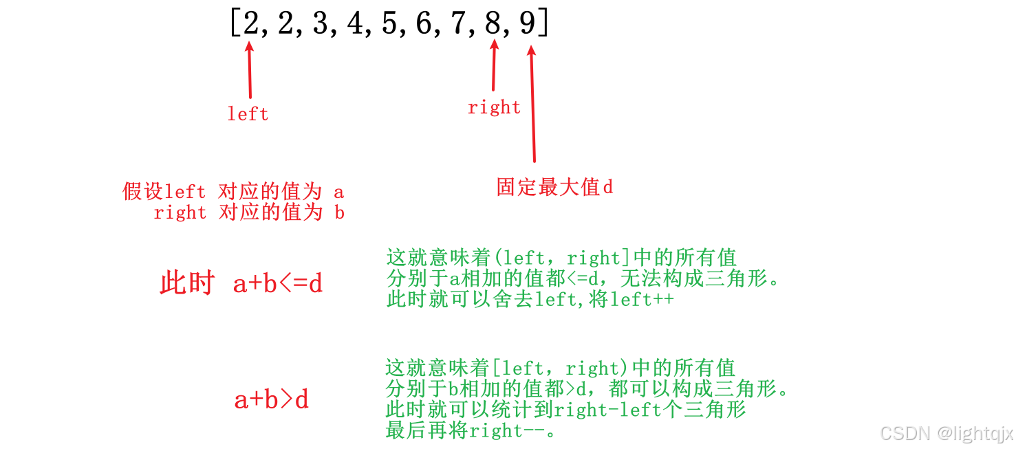 - 如果nums[left]+nums[right]<=d,则三角形个数就只讲left++