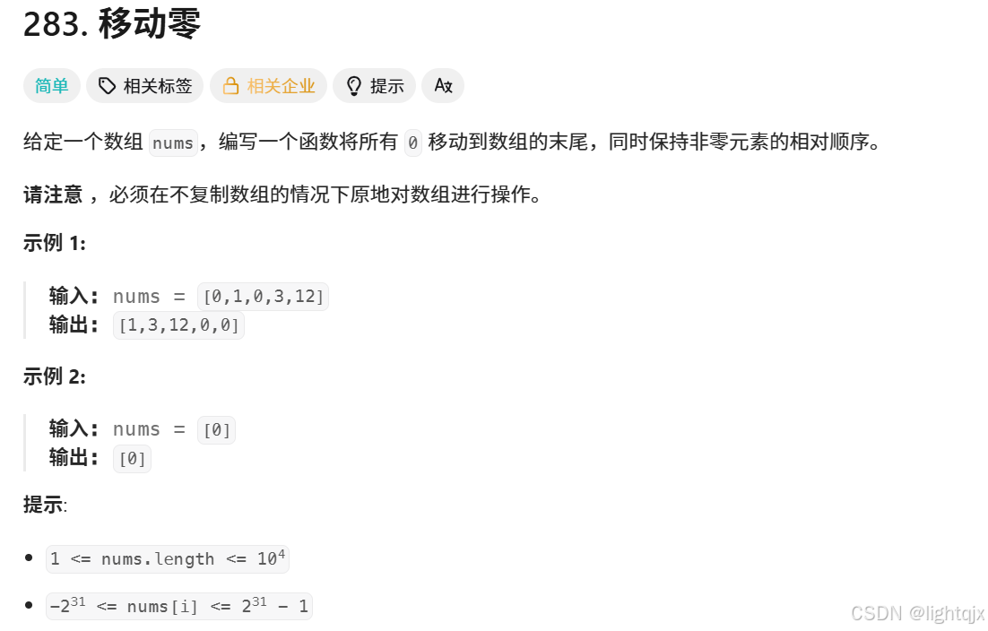 如上图,示例也给出来了:数组:[0,1,0,3,12] 移动后需要变成 [1,3,12,0,0] 。