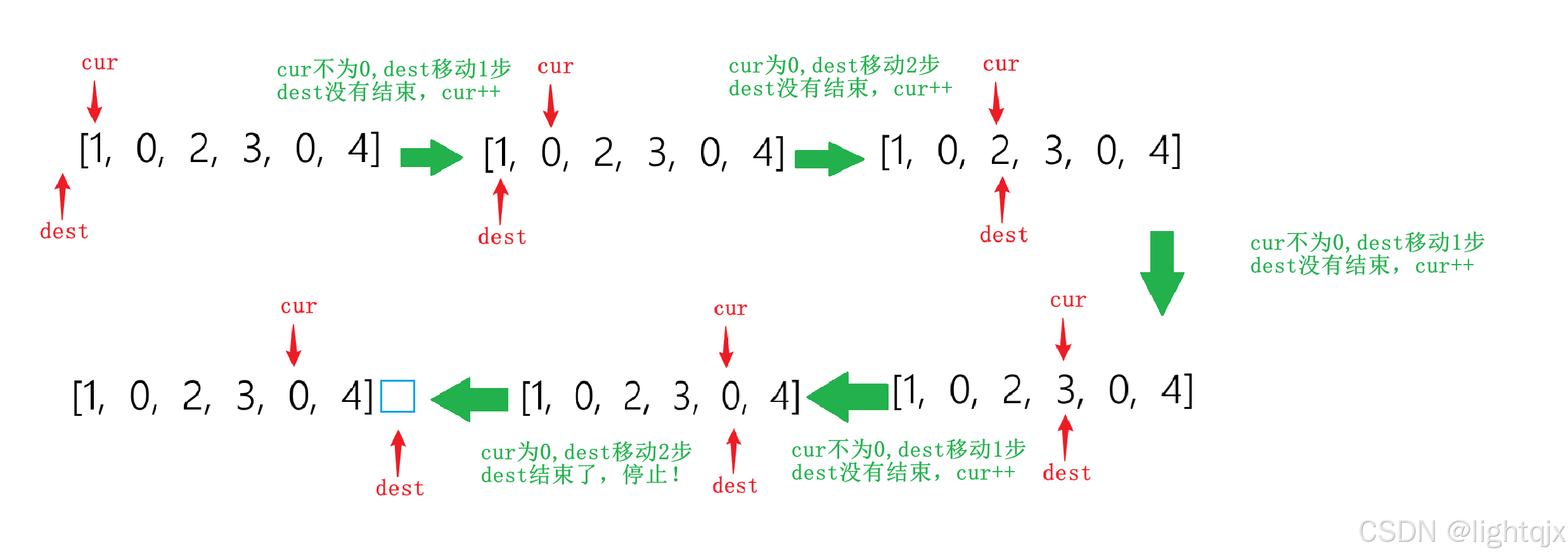 若cur不为0,dest只在当前位置复写cur所在的元素,完成复写后将dest和cur同时向前移动一位