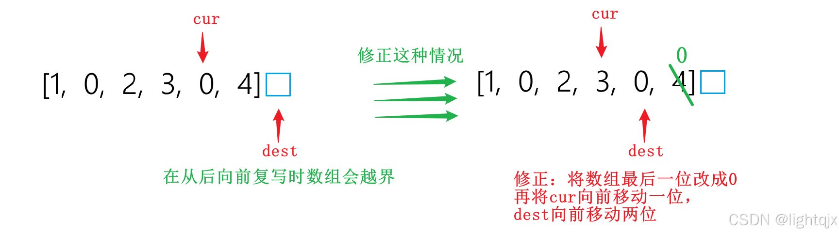 因为dest越界情况是因为cur为0时才出现的,所以我们就只需要将数组最后一位改为0,再将cur向前移动一位,dest向前移动两位就可以正常复写了:
