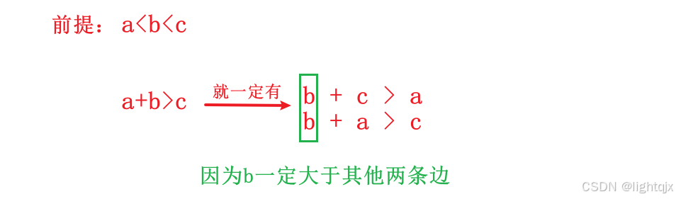 首先我们知道要构成三角形,就必须满足任意两条边大于第三边,其实也就是较小的两条边大于最大的那一条边就可以了。因为: