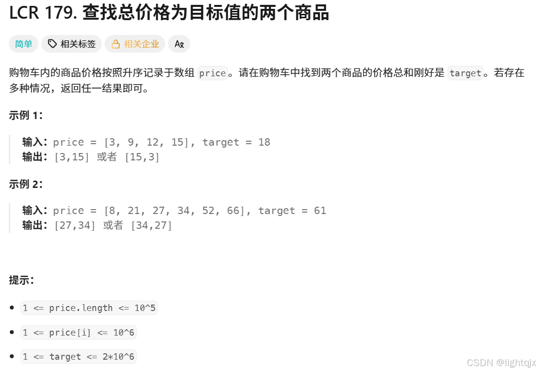 题目链接:LCR 179. 查找总价格为目标值的两个商品 - 力扣(LeetCode)