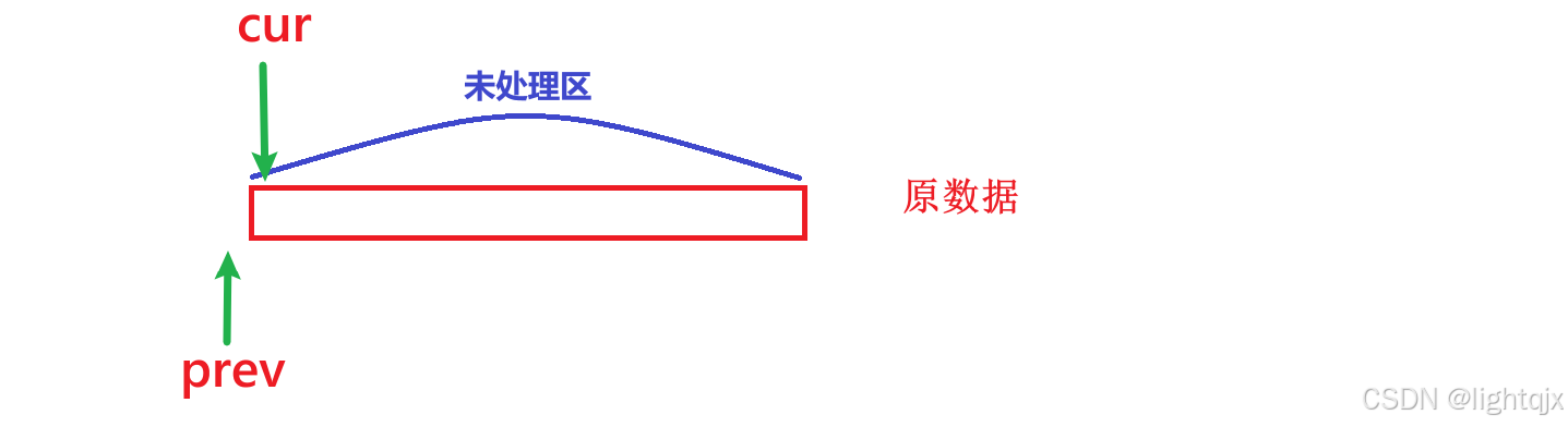 初始时 数组都处于未处理状态,此时cur就指向第一个元素,prev是处理区里的最后一个非零元素,所以这时prev就指向第一个元素的前一个位置: