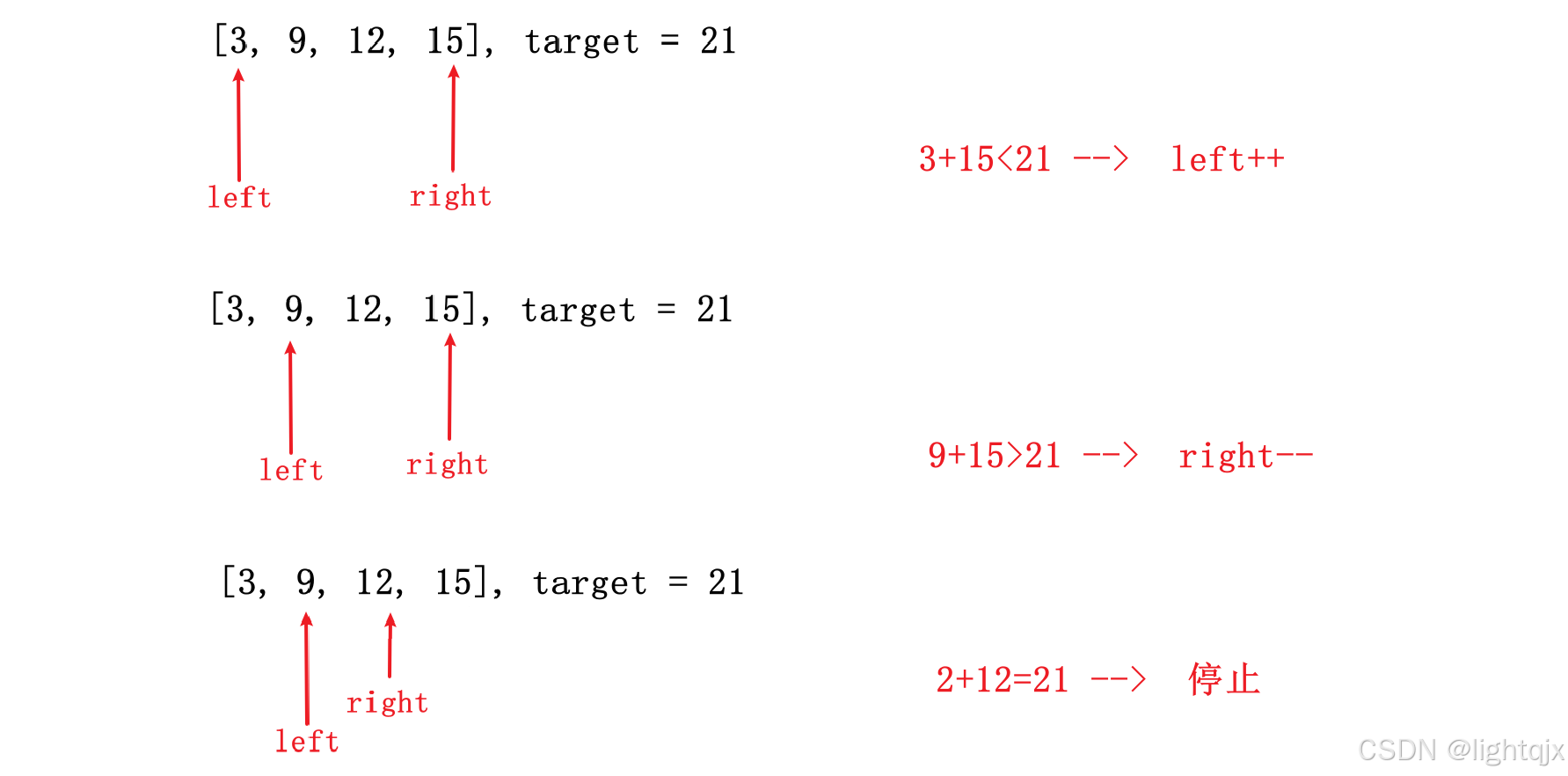 因为我们的原数组是有序的。所以我们就可以将左边的值标为left,最有边的值标为right。通过判断条件来移动双指针,从而找到等于target的两个值。