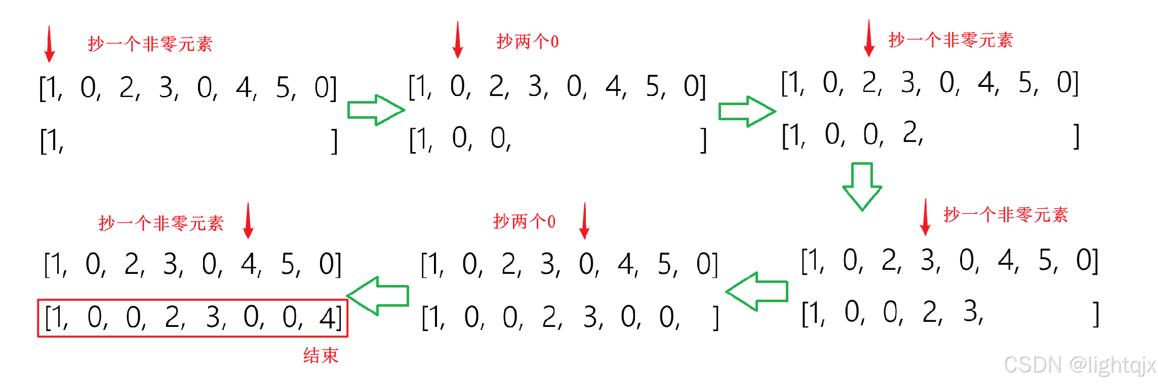 如果是异地操作 :先开辟一个与原数组大小相同的新数组,然后当我们从左往右遍历[1,0,2,3,0,4,5,0],当遇到非零数据时,就将该数据抄到新数组中去;当遇到零时,就将该数据抄两遍到新数组中去。重复此过程直到新数组满了就停止。如图所示:
