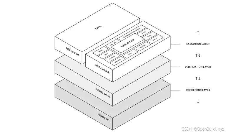 Nexus 区块链采用双核并行架构(NexusEVM + NexusCore)和三层设计(执行层、验证层、共识层)。
