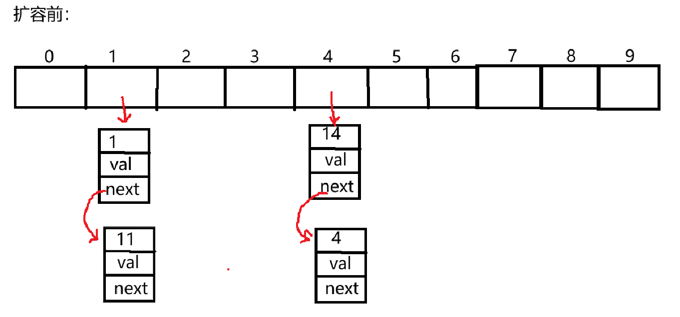 扩容前节点的存放坐标是通过int index = key%array.length(1%10,11%10,14%10),Node cur=array[index],后遍历,进行尾插;