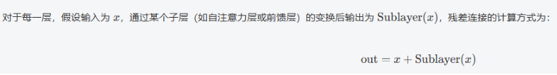 这种连接方式保证了在网络初期,若子层变换的结果接近于零,则输出与输入相同,从而缓解了深度神经网络中梯度消失的问题。