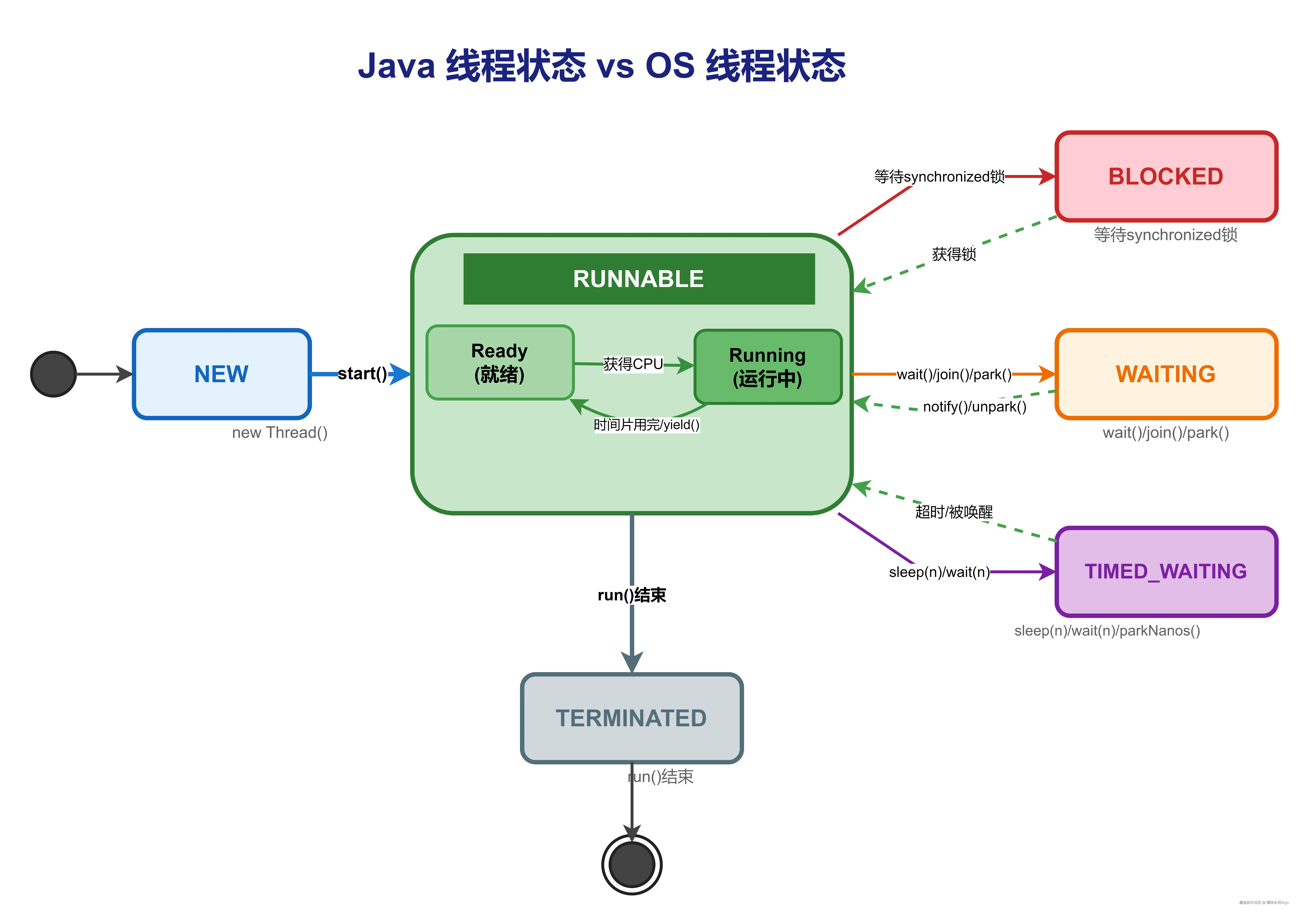 - Java 线程状态是对 OS 线程状态的抽象封装
