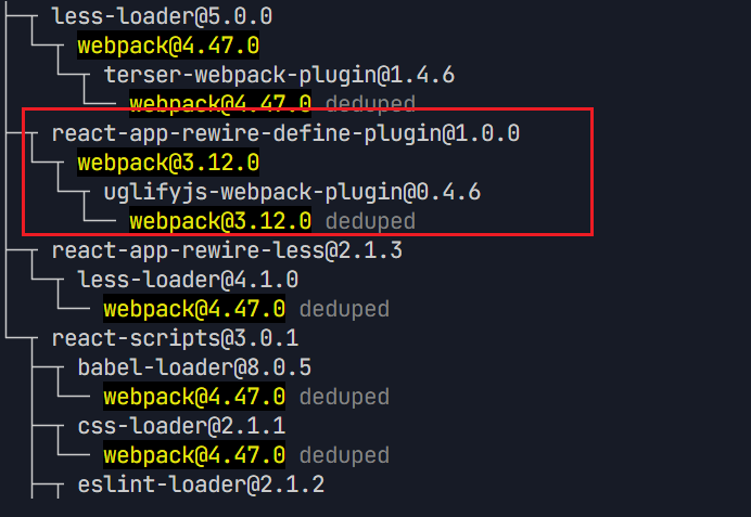 使用npm ls webpack命令查看webpack版本,果然发现了异类,这个时候就要分析这个依赖了,如果能修复尽量修复,我是经过反复查找,发现项目中没有使用,然后就删除了,接下来删除lock文件或node_modules重新安装依赖,问题完美解决。