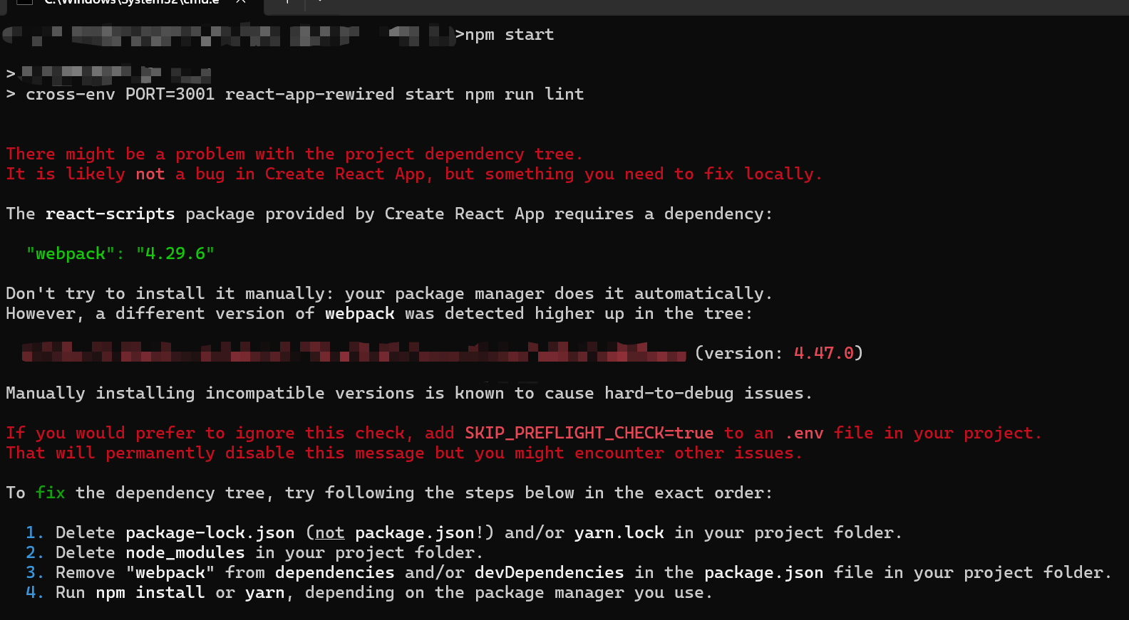 接下来要分析原因。根据报错信息,Create React App工具链会进行预检(preflight check),确保依赖树中的特定包版本符合要求。例如,react-scripts可能需要某个确切版本的webpack,如果项目中存在更高或更低的版本,就会触发这个错误。这时候有两种选择:要么修复依赖关系,要么用SKIP_PREFLIGHT_CHECK=true来跳过检查。