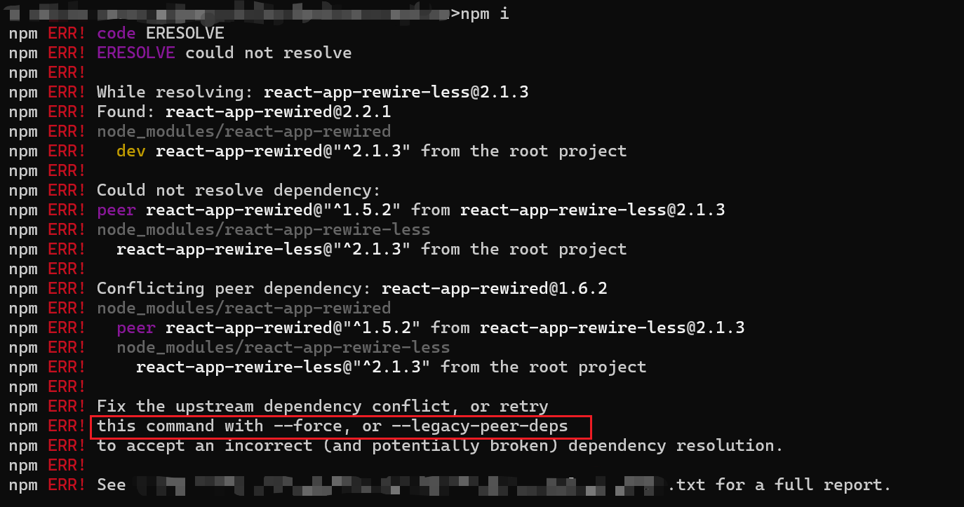 当执行 npm install 遇到依赖冲突时,可以使用 --force 或 --legacy-peer-deps 参数来解决问题。