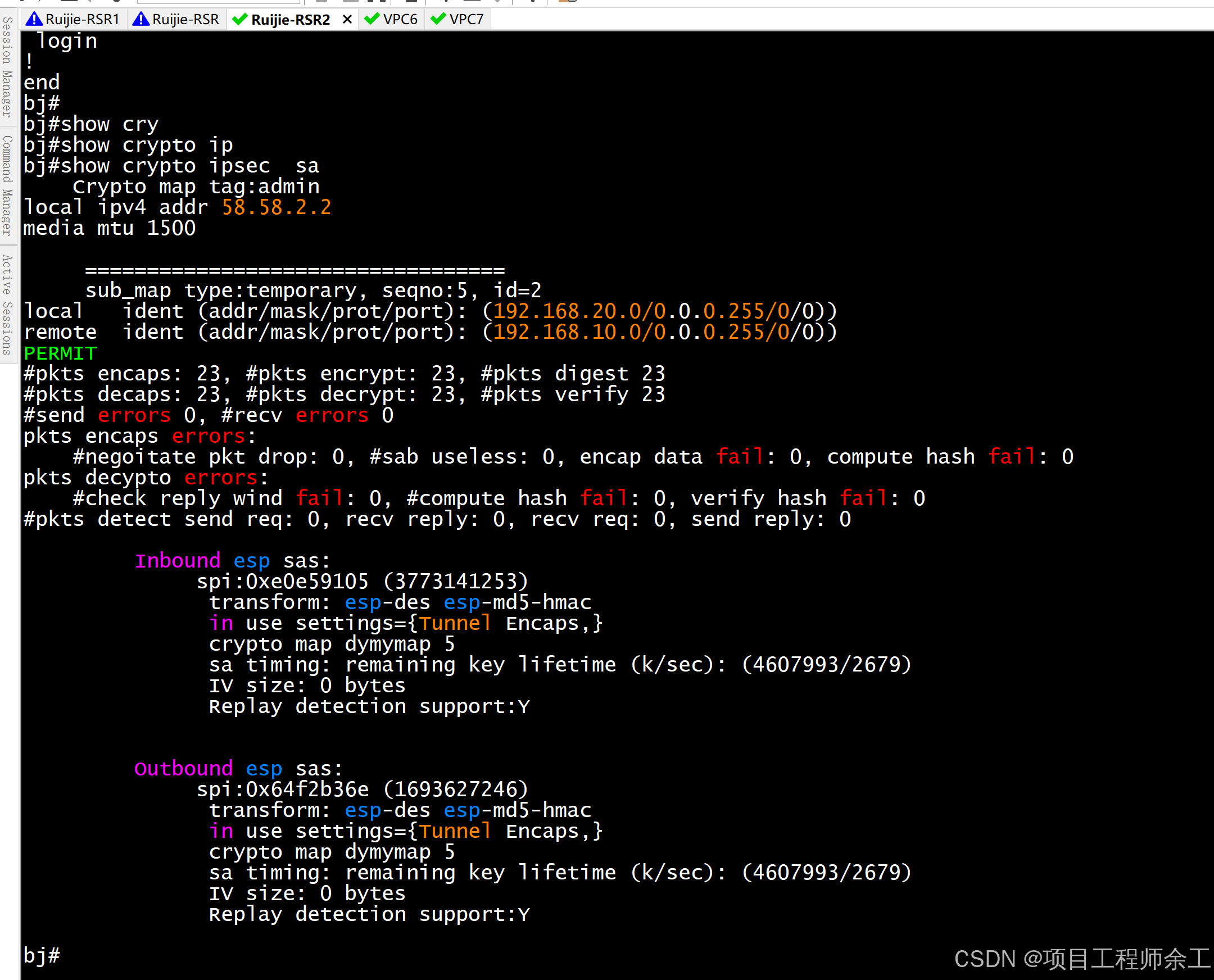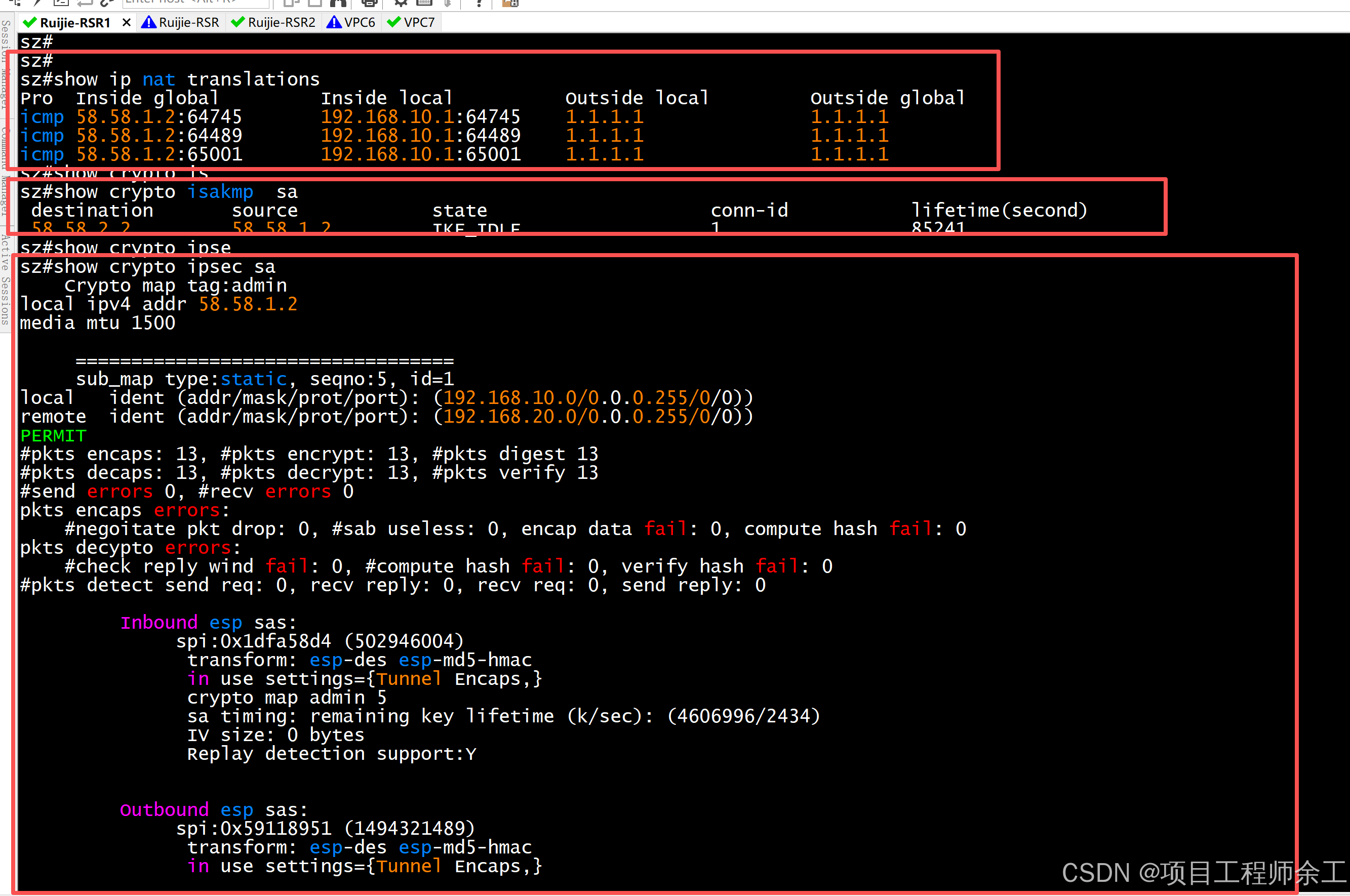 上面是nat记录同,下面是ipsec数据(注意两pc不ping一下,是看不到任何ipsec数据的,必须得先ping一下触发建立)