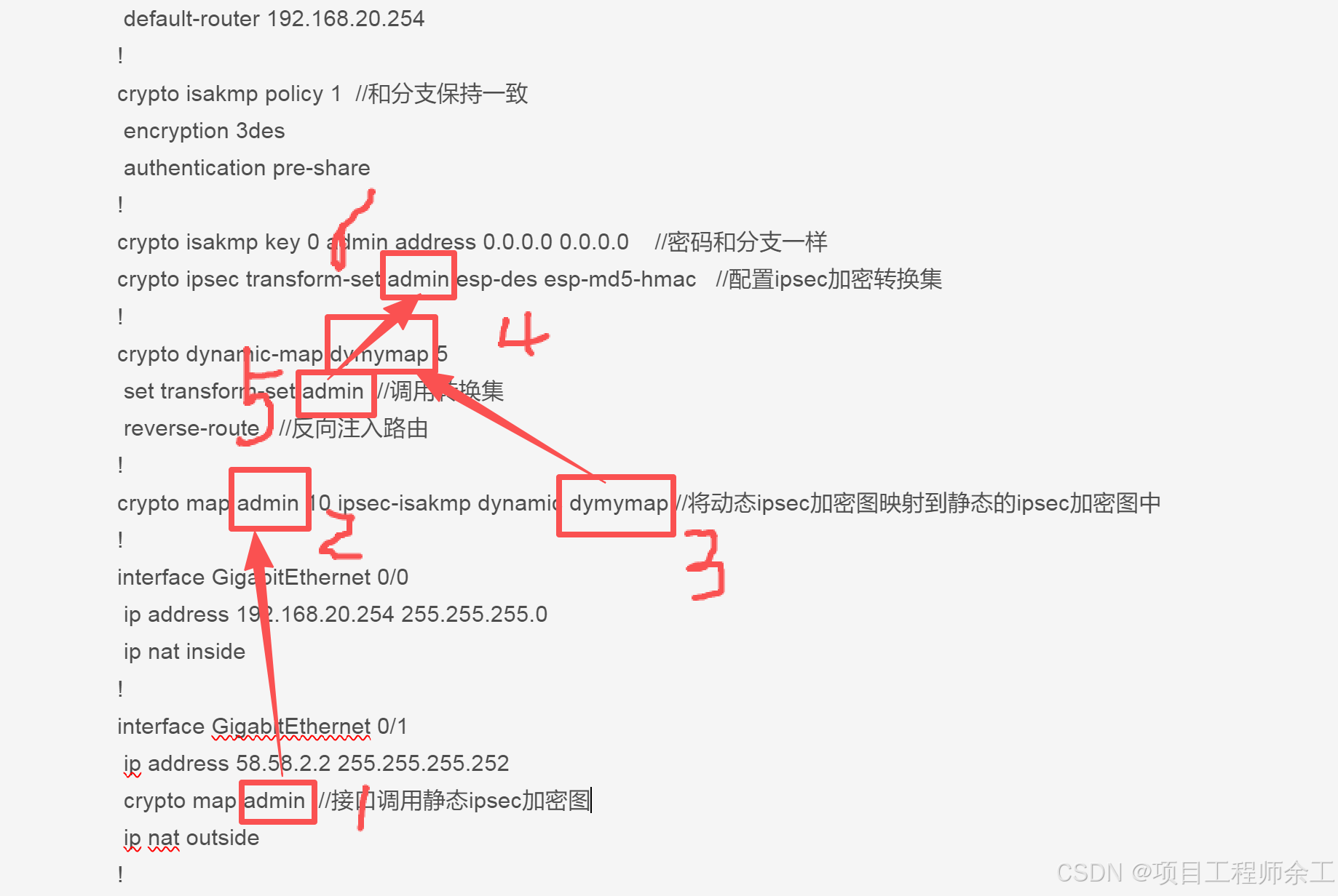 crypto map admin 10 ipsec-isakmp dynamic dymymap //将动态ipsec加密图映射到静态的ipsec加密图中