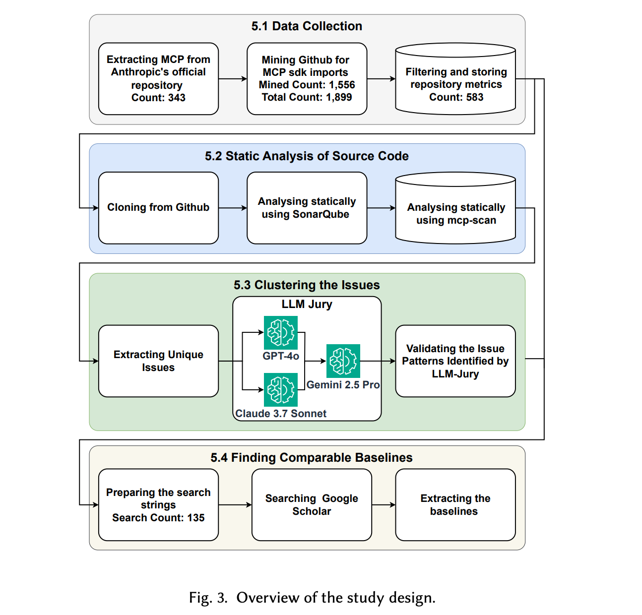 (2-1).传统工具分析:为检测MCP Server中的安全漏洞、code smell和bug,作者采用广泛使用的开源静态分析工具SonarQube。相比FindBugs和PMD,SonarQube支持 30 多种语言,无需编译字节码,并内置符合MITRE CWE Top 25、OWASP Top 10和PCI DSS等行业安全标准的检测规则,同时擅长识别可维护性问题(如code smell和bug)。针对583个仓库,作者 (i) 从GitHub克隆仓库;(ii) 通过 Docker部署的SonarQube CLI进行扫描;(iii) 利用SonarQube Web API提取问题级元数据;(iv) 将结果存入 Elasticsearch以支持高效查询。单个仓库扫描耗时30秒至5分钟不等,全部分析在一台M3 MacBook Air上于四天内完成。