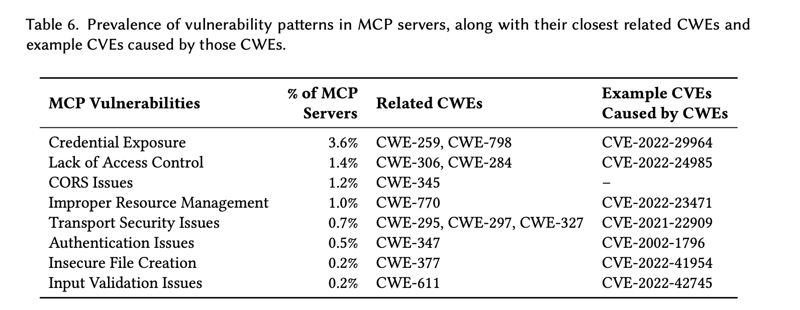 | 2. 漏洞普遍性 | (1).7.2%的MCP仓库 (42/583)含至少一个安全漏洞;其中一半 (≈3.6%)为凭证暴露。(2).共检测到277个漏洞 ,关联13个CWE,多个CWE对应已知CVE(如CVE-2022-29964),说明风险真实且严重。 |