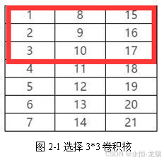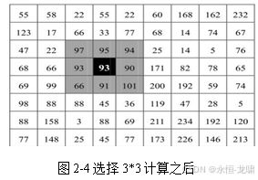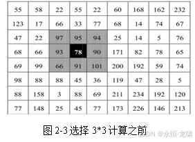 对于矩阵图2-1所示,对所选定的3×3矩阵,选定中心像素点,对这个矩阵进行运算