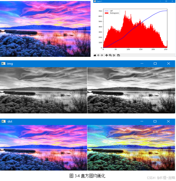 4.使用直方图均衡化测试结果如图3-4所示,其中左上为原图,figure1为直方图,img为直方图均衡化,dst为彩色直方图均衡化