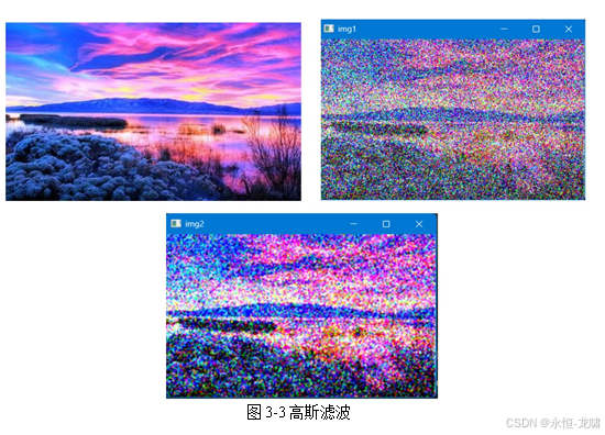 3.使用高斯滤波测试结果如图3-3所示,其中左上为原图,img1为添加高斯噪声图,img2高斯滤波处理结果